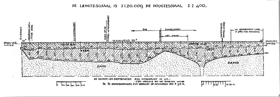 Op de tekening het geologisch lengteprofiel van Schokland van het zuiden naar het noorden, getekend naar boringen van Lucas Seidel in 1804.
