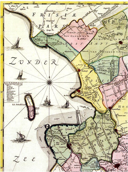 Kaart Ten Have 1743Vanaf 1660, na de aankoop van Emmeloord en Urk, speelde Holland, met name Amsterdam, een steeds grotere rol in het behoud van het eiland en de beveiliging van de vaarroutes. Deze kaart uit 1743 bevat een gedeelte van Overijssel. Op de kaart staat een verdeeld Schokland. Het noorden viel bestuurlijk onder het bewind van Amsterdam, het zuiden onder Overijssel. De kaart was een hernieuwde en aangevulde uitgave van die van Nicolaas ten Have uit 1648 en werd gedrukt door Jan de Lat in 1743.