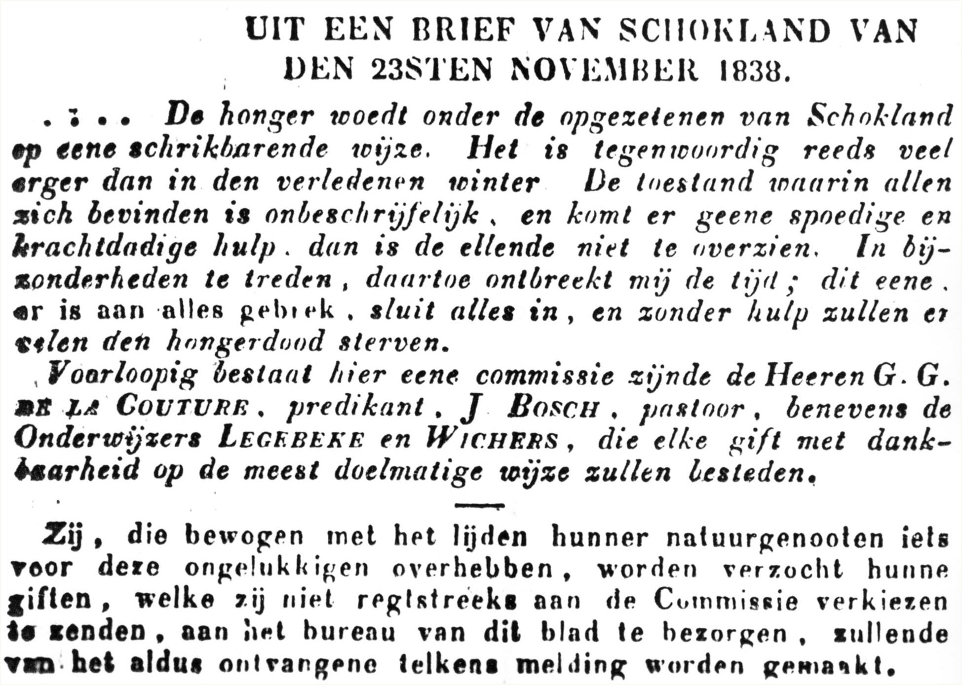 tot financiële steun van de arme Schokkers in de Kamper Courant (november 1838)