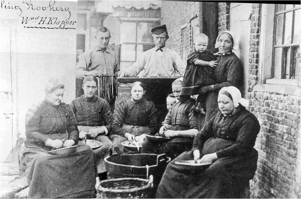 Foto: de familie Klappe(r) bezig met de verwerking voor de palingrokerij.