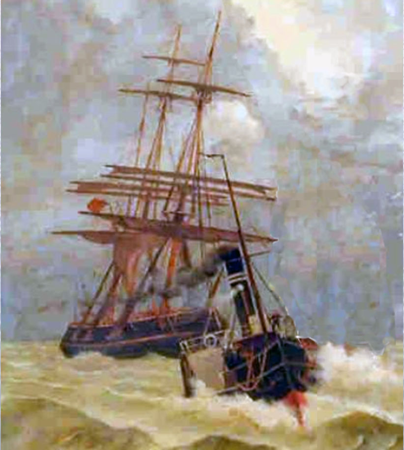 Rechts: het uitslepen van een bark. Scheepvaartmuseum Amsterdam. Anoniem schilderij 1875 (uitsnede)