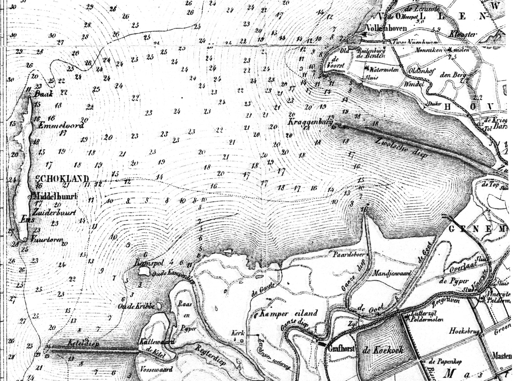 Rechts: de waterdiepte in de ZO-hoek van de Zuiderzee omstreeks 1850 in decimeters. Bij ‘normaal water’ stond er minder dan 1,80 m water in Zwolse Diep. Het gat van Ens was 2,30 m diep.
