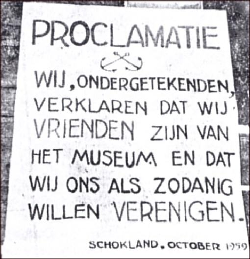 Bij het museum had zich een groot aantal polderbewoners verzameld. Zij hadden reeds een strijdlied ingestudeerd en op het moment dat de stoet het museum bereikte barstte de menigte uit in: 'Wij zijn niet bang'. Nadat het geroofde was teruggegeven sprak drs. A.P. de Haan, namens de Directie Wieringermeer, de studenten toe. Hij beschuldigde de heren van lafheid. Ze hadden een overval gepleegd op een eiland waar zegge en schrijve maar één man en één vrouw woonden. Tot een terechtstelling kwam het niet, want, aldus de heer De Haan, er was geen beul aanwezig. De brute overval had nog grote gevolgen: de heer Van der Heide vertelde ter plaatse dat er binnenkort een officiële oprichtingsvergadering van de vereniging Vrienden van het Museum zal worden gehouden! En dat gebeurde twee jaar na dato, in 1961. De vereniging heet inmiddels Vrienden van Schokland.